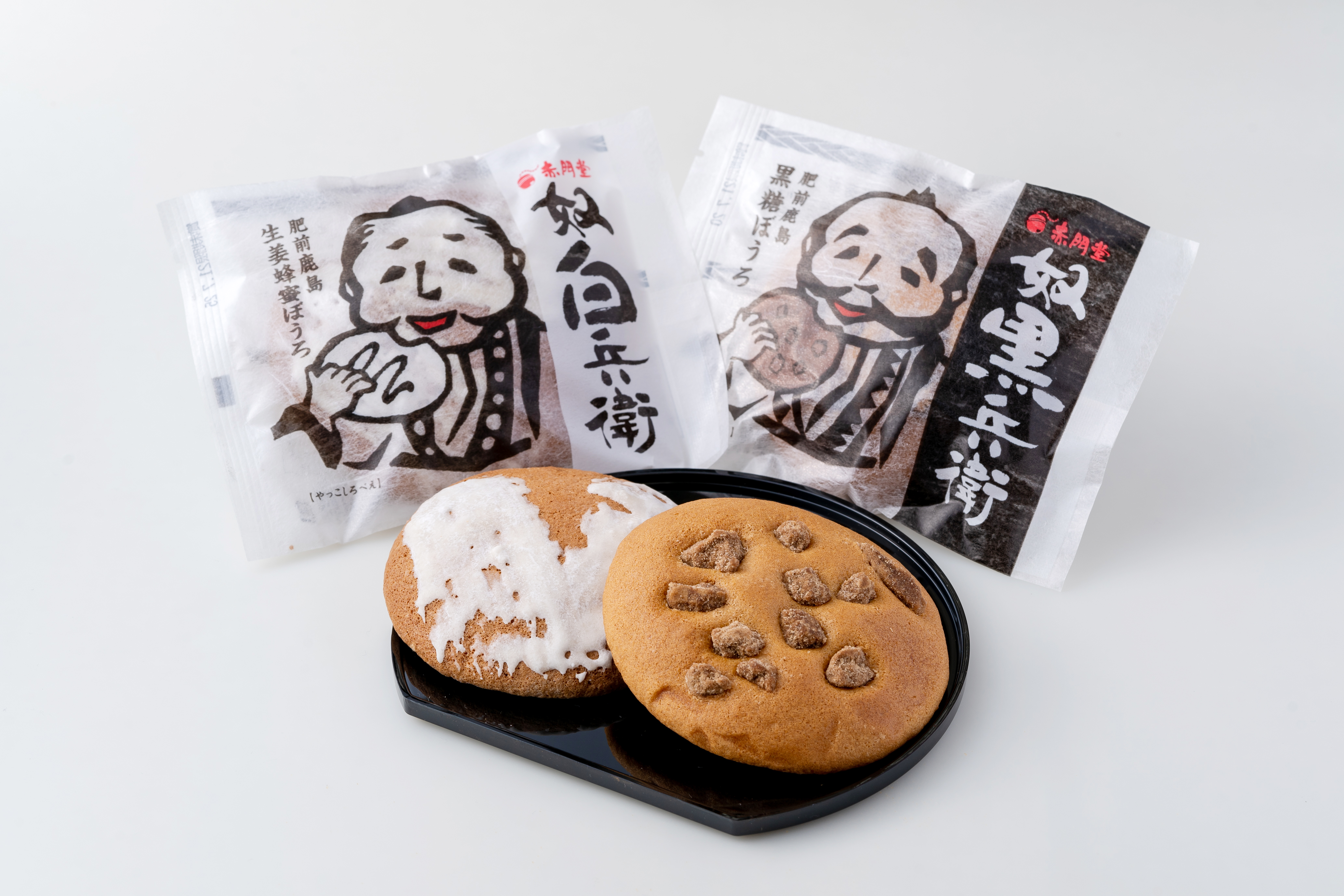 生地に黒糖や丸大豆醬油こうじ、黒みりんを練り込み表面に粒々の黒糖をのせた『奴黒兵衛』、生地に奄美諸島の粗糖、淡口醬油こうじ、白みりんを練り込み表面に白い生姜蜜をりんかけした『奴白兵衛』、佐賀県産の温州みかんを使った『みかんぼうろ』をセットにした、丸ぼうろの食べくらべセット。