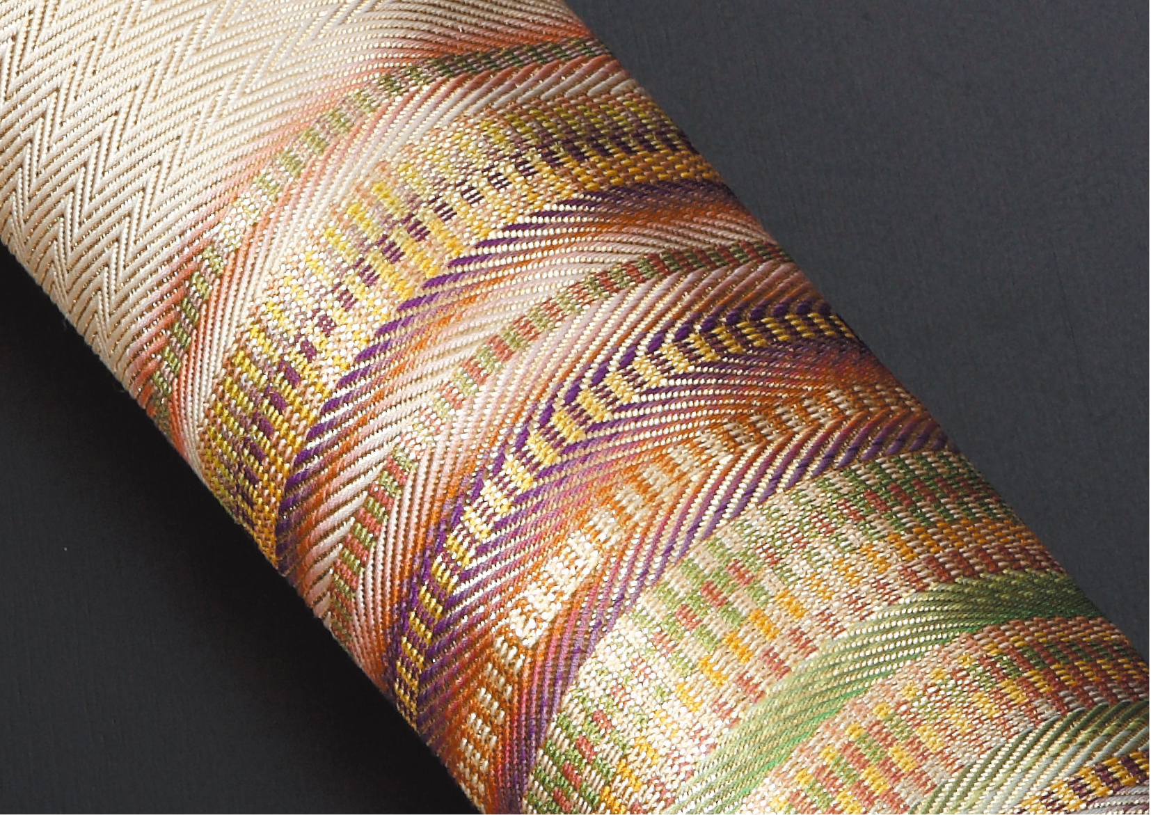 鹿島錦は、経糸(たていと)に上質な金銀漆の箔紙、緯糸(よこいと)に色とりどりの本絹糸を使った手織りの工芸品です。