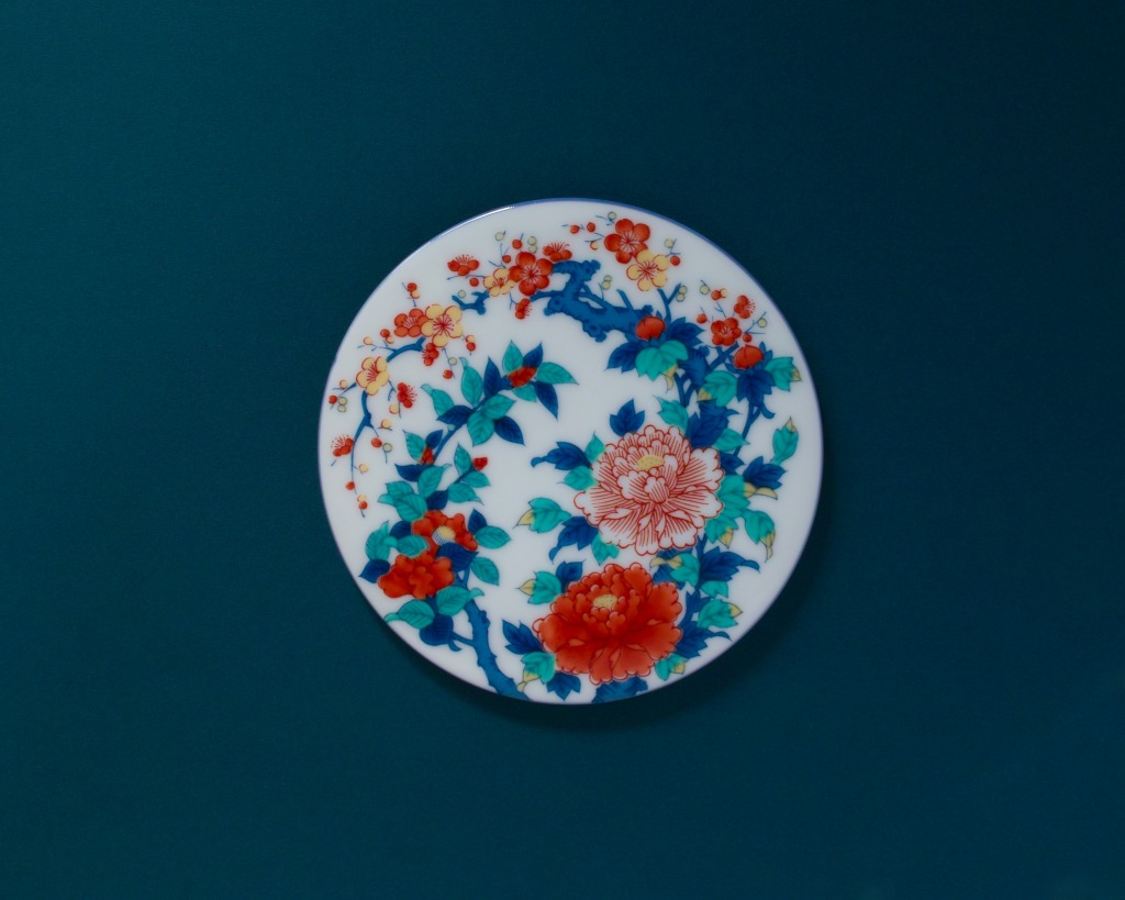 鍋島焼開窯350周年を記念して制作された、四季の花々をあしらった絵皿です。